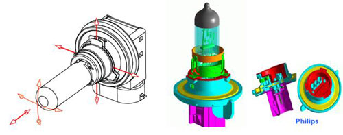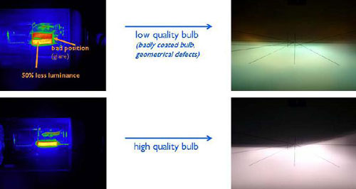 此外,飛利浦高效能鹵素燈泡鎢絲採用六軸幾何校正,提供最高標準的精準度( 定位圖示如下)。從輸出光形的結果可看出鎢絲幾何校正的重要性:
