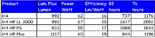 飛利浦高效能H4根據客戶不同需求,開發出不同規格的燈泡,與標準型H4相同的流明,但是功率消耗更低,壽命時數卻更長。