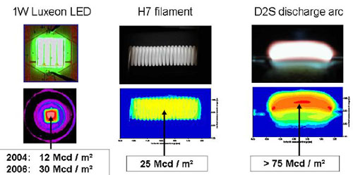 從高效能H7的鎢絲光通量值 25Mcd/m2,可看出等同1W的 Luxeon LED甚至氣體放電燈D2S的高流明表現: