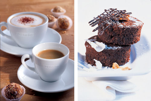 Miele蒸爐除了一般料理之外,還可以利用蒸煮的方式製作出美味的巧克力蛋糕,作法簡易,只要把70%巧克力110g放入容器中,以攝氏100度蒸1分鐘,將打好的奶油75g和vanilla糖75g加入蛋黃打發,拌入核桃粒75g、麵粉75g、麵包丁75g,在放入打好的蛋白,放入六個內塗好奶油小杯模中,蓋上錫箔紙,放中爐,以攝氏100度蒸20-25分鐘後取出,放入盤中加以點綴即可完成。