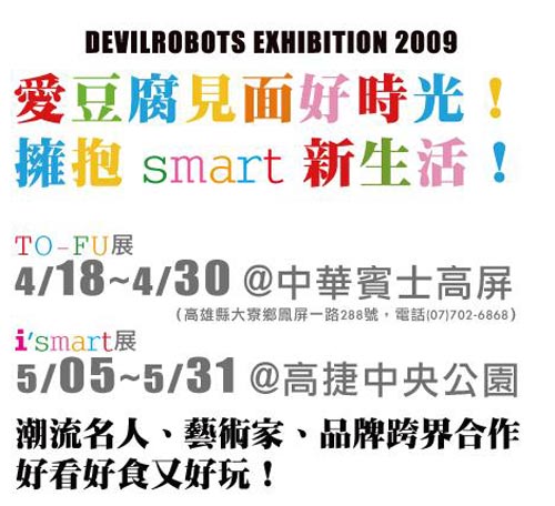 迫不及待的smart迷,還可以提早在4月18日至30日到smart高屏展示中心(高雄縣大寮鄉鳳屏一路288號)搶先目睹即將在「高雄設計節」亮相的「豆腐人 TO-FU OYAKO」展,日本限定品、絕版品、非賣品讓您一次看足。