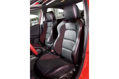 | 內裝配置的雙前跑車座椅,除了火紅色車縫線設計引人矚目之外,兼具舒適與包覆性的乘座質感也讓身體獲得良好的支撐力。 |