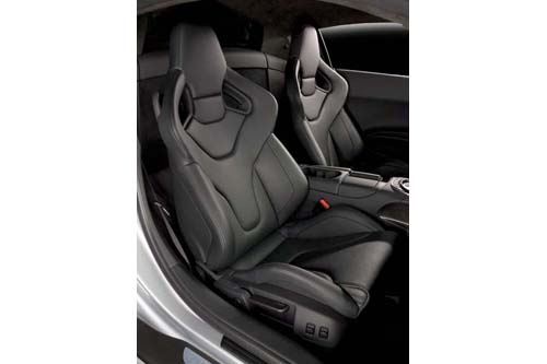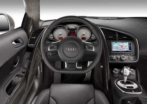 這幾年來全球千萬身價等級超跑擁有共同的設計趨勢,那就是內裝設計除了要擁有一定程度的戰鬥氣息之外,周邊駕駛介面等配備則愈來愈豪華、舒適。先前曾有國外媒體批評R8的內裝設計遠不比外觀來得強烈、前衛,關於此點筆者個人頗不認同,因為我們在R8車內見到Audi設計師的不凡功力,幾近於方程式賽車座艙氛圍的「單艙式」賽車車艙設計概念,經由可調式真皮類賽車椅(原廠可選配桶型設計)、365mm平底三幅式賽車方向盤與車門把手延伸連結至中控儀錶檯而成功營造出來。