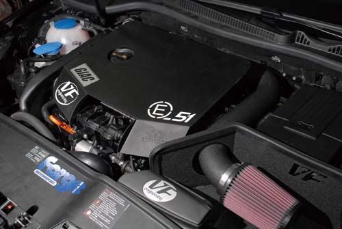 我們這次跟台北三鑫 (GIAC台北) 合作的GTI,應該是國內截至目前為止,唯一可以DSG變速箱做出420hp的實車,引擎肚內改裝了VF針對420hp增加的鍛造連桿、鍛造活塞,以及片數增加的多片式離合器,目前增壓1.65bar,為了比賽會繼續嘗試將增壓值再朝1.8bar以上調整,肚內強度絕對足以負荷。當然,這是在兼顧全面性的前提之下去調整,畢竟比賽要的並不只是一瞬間的最大馬力。