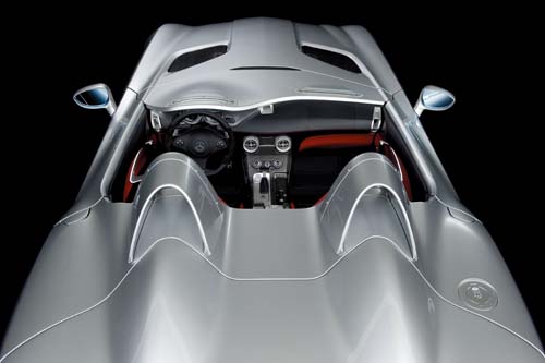 SLR Stirling Moss外型上的最大特點是沒有前擋、車頂與車窗,以開放式座艙讓駕駛者享受超高速馭風快感,其並十分重視空力設計,如座椅後方設有含一體式防滾桿的雙駝峰、控檯前方加裝一小片玻璃、引擎蓋附有三個進排風口等等,這些也都是300 SLR的主要象徵。此外,本車側面線條是完全針對破風而來,同時包覆車底的大型分流器可追求後軸最大的下壓力,而時速達120km/h自動升起的尾翼,亦可手動控制當作空力煞車輔助所用,加上開放式座艙能大幅降低空氣阻力,空力上已毫無弱點可言