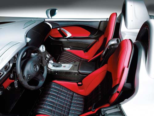 至於內裝構成方面,本車主要以碳纖維、麂皮、真皮構成,營造濃郁戰鬥風格之餘,質感上亦能達到最高點,同時控檯、排檔桿均貼有Stirling Moss的鋁質簽名銘板,這自然是至高無上的榮耀象徵。SLR Stirling Moss的底盤序號只有1~75,所以未來決不會有追加的情況,其生產時程則在今年6~12月,而75萬歐元的售價更可買下兩部硬頂SLR,也是M.Benz有史以來最貴的車款。