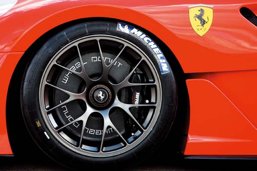 此外,599XX還加裝有F1式樣的碟盤護蓋,一方面降低空氣阻力、一方面提昇煞車冷卻效率,可謂各個細節都不輕易放過。除了一身的碳纖維空力勁裝外,599XX另配用競技化陶瓷碳纖碟盤,由於來令片同樣為碳纖維之故,相對卡鉗可隨之縮小達到輕量化之功效,同時其採用了前29/67/19(11.0J)、後31/71/19(12.0J)的光頭胎,一切都是為了提昇賽道的循跡性而來。