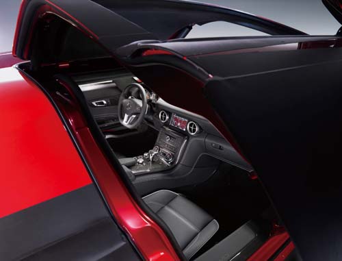 作為M.Benz的超跑,SLS同樣融合了舒適性與豪華感,首先本車引以為傲的鷗翼式車門就特別注重便利一項,此車門全開具70度的廣開角,距離地面可達到1.5公尺,與車門下緣相距亦有1.08公尺(路面至門檻約45公分),出入車艙時自然更為容易。在此其車門並於絞鍊旁裝設二支氣壓挺桿,只要稍微施力便能輕鬆開關,同時鷗翼車門展開的空間低於傳統車門,在一般車庫時也能全開,便利性可說是相當高。