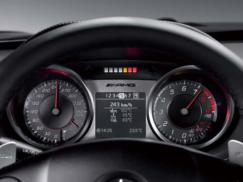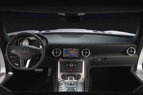 SLS的365mm三幅式方向盤為下方切平的橢圓形設計,中央並嵌入金屬幅條而相當有特色,其同時附有鋁合金換檔撥片與多功能快撥鍵,並能透過儀錶板屏幕進行音響、電話、導航、聲控等操作,加上擁有伸縮60mm、仰角2.3度的電調功能,對駕駛者而言一切都顯得非常便利、就手。SLS的雙環白色背光儀錶板主要為時速、轉速顯示以及附加燃油錶、機油溫度計,銀色刻度盤的錶底更高達360km/h與9000rpm,加上中央上方的7顆LED升檔指示,性能感相對達到最高點。