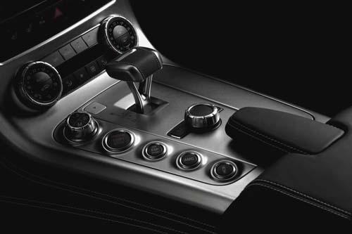 在內裝造型的展現上,SLS還以大量的暗銀色金屬飾板營造凜冽風格,尤其是中控檯展現出濃厚科技風味,例如稱為「E-Select」的電傳線控排擋桿,進入各種檔位只要觸碰一下就能一次到位,後方的Comand轉盤及左上的「AMG Drive Unit」整合旋鈕,則便於設定影音介面與駕駛模式。值得一提的是,AMG Drive Unit主要是四段調設變速箱換檔模式含引擎反應(C/S/S+/M),以下依序排列的是引擎啟閉開關及ESP、AMG記憶、電子避震器作動選項鈕,同時所有的操作按鍵都運用軟質塑料且加入琥珀色照明,各項細節的講究也能符合其身價。