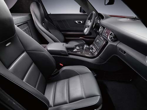 相當注重內裝質感的SLS,不但頂篷使用Alcantara麂皮,包括儀錶檯、門板、中央扶手、座椅均採取Designo Nappa頂級皮革手工車縫而成,同時兩張跑車椅的骨架為超輕量的鎂合金材質,相形也利於重量分配與低重心化設定。主要襯墊充填軟質泡棉但外側凸緣加硬的SLS桶椅,訴求於長距離行駛的舒適性,以及給予激烈操駕時最佳的橫向支撐,其並具備10項電調與3段加熱功能,腰靠及側面包覆緊度亦可調整,相信各種身材的駕駛者都能很快找到適合自己的戰鬥坐姿。