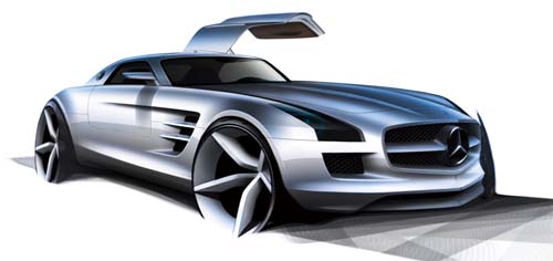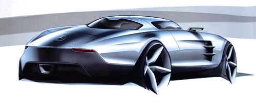 | 原廠公佈的外型手繪設計圖可看出SLS相當漂亮,而且充滿了夢幻駿逸之感。 |