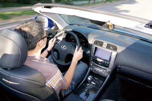 操作敞篷時相當簡單,電控開關就設於方向盤基座左手方而已。只需持續按下開關即可操作,同時在儀錶板中央的多功能顯示幕亦會顯示敞篷作動情形。值得一提的是IS250C搭載了「智慧型偵測功能」,透過倒車雷達來偵測尾箱蓋開啟距離是否足夠供敞篷機構開關篷,相當方便且安全。
