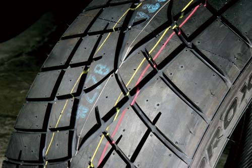 | 屬於新設計的不對稱胎紋外側胎塊多強調大面積提供過彎時更加優異的抓地力,內側胎紋則可針對靜肅性與排水性進行加強。 |