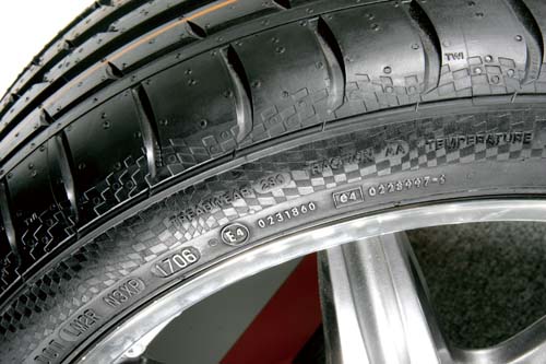 目前一些經濟胎的TW值大約為320~460之間,高級房車胎則為280,性能街胎多半為140~180,低於此數值則已歸類為競技取向的輪胎。至於輪胎製造日期的原因在於,由於保存期限多半以五年為分水嶺,超過期限後其膠質會開始硬化而失去原有的抓地力,滾動噪音也會提高,但許多車友常會有愈「新鮮」的新胎愈好的迷思其實不盡然,以抓地力與耐磨表現來看通常是以1年左右新胎表現最為優異,而製造日期會標示在輪胎內外兩側以第幾週+第幾年共四個數字來呈現,如果看到的數字為1609,也就是該輪胎的製造日期為2009年第16週所生產。