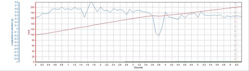 | 雖然在100km/h出頭時發生了不小的Lag,不過最大G值硬是達到0.834G,100~150km/h的加速也只花了2.51秒,且換上四檔後依舊能保持0.3G以上的加速力道。 (換檔部分圈起) 3檔換4檔:0.39秒 |