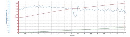 | 西螺號的加速G值真的相當穩定,103km/h後可以保持0.4G以上的加速力道,最大G值更達0.549G,不過因為末速開始抓水溫,力道也瞬間由0.3G以上滑落至0.185G。 (換檔部分圈起) 3檔換4檔:0.30秒 |