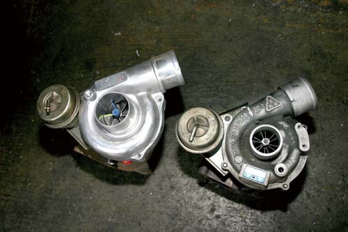 | Audi/VW的原廠K03渦輪(圖右),可將進氣端的葉片與外殼加大為K04 Pro。 |