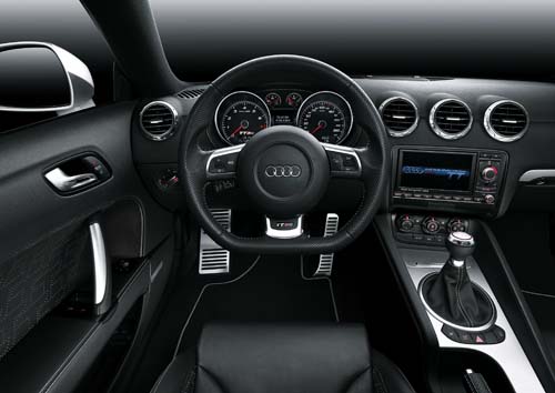 TT RS的內裝目前僅有黑色單一配置,以Alcantara與真皮兩種材質組成的跑車座椅並且附有加熱功能。車內飾板則採用刷紋鋁合金製造。而為了營造出強烈的運動形象,方向排採用平底式設計,並且在上追加多功能控制按鈕。比較特別的部份在於此車追加了增壓值、機油溫度、單圈計時等功能,均可透過儀錶板上的多功能顯示幕呈現與操作。