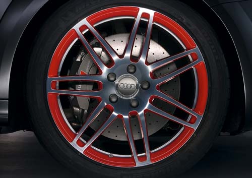 擁有超強的動力輸出,當然也得配上夠用圈胎與煞車才行,這部車採用尺寸高達21吋的輕合金輪圈,此輪圈的造型與RS4車上所使用的款十分接近,倒是直徑放大了不少;而為了對應強大的動力輸出與驚人的速度,在21吋輪圈內的煞車系統也換上了Audi特製的陶瓷煞車系統,相對於不少跑車製造商已經開始大量採用此一配備,目前Audi僅有少數高性能車款能夠選用此一裝置。