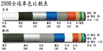 | 北美/白色 20%/黑色 17%/銀色 17%/藍色 13%/灰色 12%/紅色 11%/米/棕色 5%/綠色 3%/金/黃色 2%/其他 <1% 歐洲 黑色 26%/銀色 20%/灰色 18%/藍色 13%/白色 9%/紅色 7%/米/棕色 4%/綠色 2%/金/黃色 <1%/其他 1%/ |