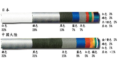 | 日本 白色 32%/銀色 28%/黑色 13%/藍色 7%/灰色 7%/紅色 3%/綠色 3%/米/棕色 2%/其他 5%/ 中國大陸 銀色 32%/黑色 31%/灰色 15%/藍色 9%/色 5%/橘色 3%/金/黃色 2%/綠色 2%/白色 1%/其他 <1% |