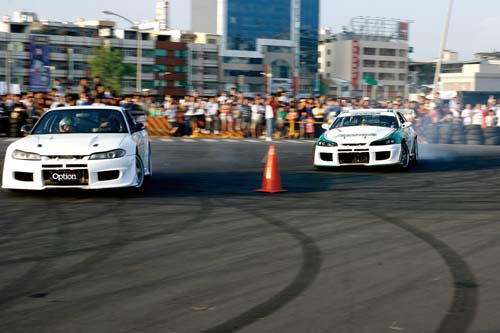 | 當天甩尾表演會由國內十位明星車手駕駛改裝相當緊繃的D1級廠車共同演出,尤其採用「雙車報隊」方式逐一出場,前所未見、創意十足。 |