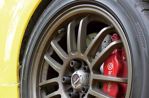 | 有效強化底盤件後面對動力大幅度攀升,原廠煞車系統似乎無力招架,為了獲得強大的制動力,Tuner特別流用前後Brembo卡鉗與330mm浮動碟。 |