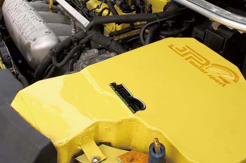 | 為了有效增加空氣力學效應讓車頭撞風同時能增加引擎散熱效率,為此車主特別訂製FRP手工引擎蓋讓左右兩側氣流導孔能確實發揮 |