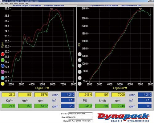 | 為了確認改裝後的性能表現此車特別前往中國悍威據點,以Dynapack進行馬力測試,軸輸出馬力高達245hp換算成淨馬力幾乎逼近275hp,強悍實力確實創下兩岸Focus改裝先例。 |