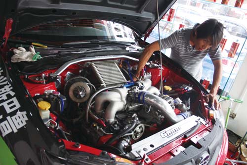 既然比賽規格是設定在珠海賽道英雄GT組的等級,近乎無限改裝的規範可是要各廠隊力拼改裝與經濟實力,而四輪驅動組之中可選擇的車型不外乎EVO或STI兩大主力,為了與日本車隊相抗衡,對於比賽車輛特別選擇台灣人較為熟悉的Subura十代STI,新車一台要價近40萬人民幣可是相當重本的花費,根據Tuner陳永輝(小咪)表示,為了一舉將動力獲得大幅度的提昇,新購買的STI從內到外幾乎全數進行性能強化,其中最為重要的引擎系統其腹內機件完全採用強化鍛造品,包含中缸強化套件、BC鍛造曲軸連桿、CP 100mm鍛造活塞、TwinPower強化大小波司、Cosworth汽缸蓋、加大氣門、強化彈簧、鈦帽、凸輪軸、汽缸床墊片與APR強化缸蓋螺絲,除了高檔套件加持外,為了獲得更為精密的組裝品質所有施工過程均經過測量處理,像是活塞與連桿重量計算,波司與活塞間隙的掌握都一併列入。而燃燒室同樣也經過加工處理以追求最佳氣門間隙與光滑表面。