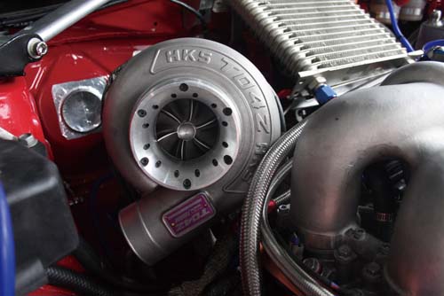 | 超大號HKS T04Z渦輪機最大馬力可對應700hp以上,對於這顆2.5升排氣量引擎低增壓即可輕鬆壓榨出400hp,要是來個高增壓肯定能直飛沖天 |