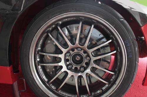 底盤方面,礙於訂製Koni競技用懸吊系統仍未及時送達,因此目前僅以HKS減震筒加BC彈簧作為基礎架構,而減輕比賽車重也是勢必要進行輕量化工程,因此特別換上前後鋁合金部品以同時獲得底盤剛性強化又能減輕簧下負擔的效果,其餘還包含Alcon前六後四多活塞煞車系統。重金所打造的比賽廠車幾乎快破千萬台幣,目前除了設定9月份珠海賽事外,年底也計畫前往挑戰澳門國際賽以展現許久未見的「台灣之光」。