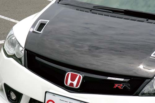 | 碳纖維材質引擎蓋上方的左右散熱孔,是仿造Mugen RR所設計,內部還設有防水隔板與排水孔,可全天候使用,而整體設計不論是位置或與葉子板間的密合度都相當不錯,很難看得出是手工打造而來。 |