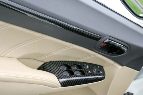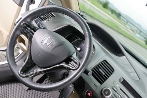 | 內裝飾板例如:中控檯、方向盤蓋、車門飾板、排檔座等,全部都已改裝夢力技研所推出的碳纖維製品,使得內裝扮像能與外觀看齊。 |