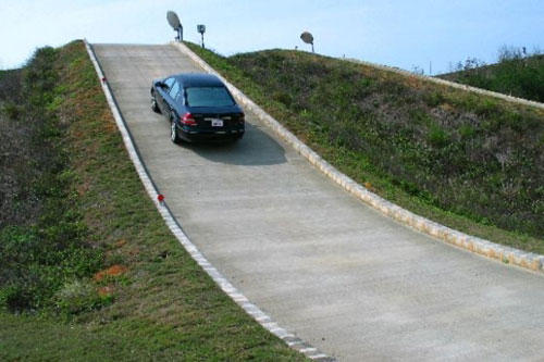 爬坡性能測試則分為爬坡速度及上坡起步能力試驗兩種,前者是試驗車輛在坡度上巡航1km的最高速度,後者則是試驗車輛由靜止出發可通過的坡度。爬坡速度係利用動力計模擬4%及12%坡度負載,讓測試車輛在動力計上以全油門行駛,記錄1km的最高穩定速度。上坡起步能力則必須利用實體的坡度,如圖1,來測試車輛上坡起步的能力,選擇最接近又小於廠商所宣告坡度的實體坡度來進行測試,不足的坡度差則以在測試車輛上添加重量補足,測試以求得最大坡度。