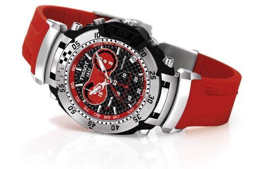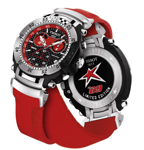 2009年 T-Race Nicky Hayden尼克.海登限量錶款以白色的時標、紅色指針與小錶圈,和運動風十足的碳纖維錶盤,形成了強烈的視覺對比,讓人為錶面上指針移動時的每一刻都目不轉睛。兩組計時小錶圈、測速儀,橡膠錶帶,均以熱情的『紅』入色,錶底蓋則雋刻眾人熟悉的Nicky Hayden幸運星符號,與其幸運數字「69」。它們不僅將為配戴者帶來好運與力量,其細膩的設計,亦象徵了Nicky Hayden全神貫於訓練,以及與追求完美表現的強大動力。