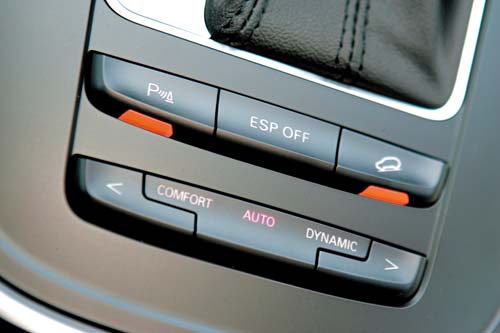值得一提的,3.0TDI車上所配置的「Audi Drive Select-可程式車身動態系統」相當好玩,系統提供自動Auto、舒適Comfort與跑車Dynamic三種基本設定,透過不同模式的選擇,電腦系統會自動搭配Damper Regulation主動式減震控制系統,及Dynamic Steering動態轉向齒比控制系統一起運作,不同的模式將提供不同的減震阻尼、轉向齒比、轉向輔助力道及引擎反應,讓車主不用換車也能擁有兩種截然不同的車輛個性。