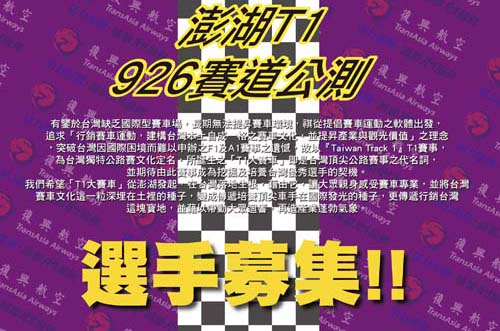 本場活動預計將以澎湖現有景觀海岸線公路-馬公市時裡井安海堤風櫃金玉殿7.8km公路,作為澎湖「T1/926賽道公測」活動場地。最寬處20米、最窄處7.5米,全程共計14個彎道,是一個極具挑戰、娛樂與安全性的多功能場地,相信必能讓車手盡享賽道體驗之樂趣。