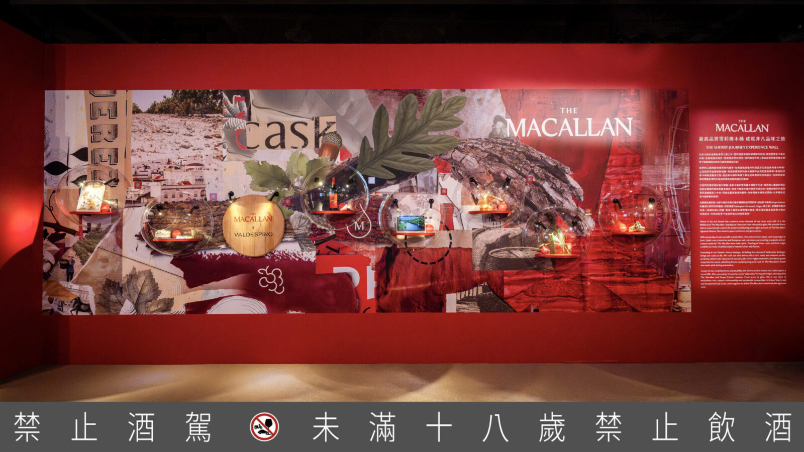 最高品質橡木桶接著送到西班牙赫雷斯進行雪莉酒潤桶,而麥卡倫擁有雪莉酒界的羅曼尼康帝「瓦德比諾Valdespino」,使用頂級雪莉酒進行潤桶,從橡實開始、精選橡木、裁切、風乾、手工定製桶至雪莉酒潤桶,每一道工序皆傾注所有心力只為成就無與倫比的珍釀,成為業界唯一擁有完整雪莉橡木桶供應鏈的威士忌品牌,從源頭即精準控制風味品質,最終送往蘇格蘭麥卡倫酒廠注入新酒靜置熟成。展覽設有從橡實到餐桌的雪莉橡木桶的完整旅程,包含雪莉酒聞香與來自赫雷斯的白堊質Albariza 土壤觸感體驗,邀請觀者親身感受雪莉王者風味的源起。