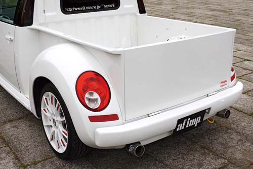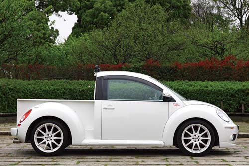 打造這輛車體的是位於東京國分寺的車體改裝店「林」,他們去年曾經以Jaguar XK8為基礎、成功製作出寬體化Aston Martin,這次則將眼光放到可愛型小貨卡身上,以這輛新款Beetle小貨卡為例,就是在車身B柱之後的部分進行加工,說起來簡單,做起來可是大工程。