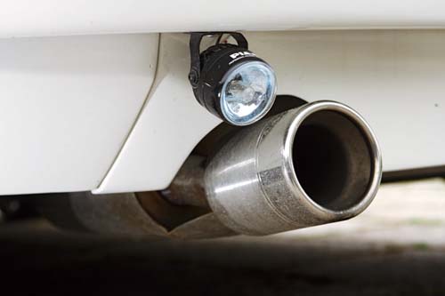 | 左右雙出式尾管的左邊上方有後向照燈,其實是流用PIAA的霧燈,夜晚看起來會很醒目 |