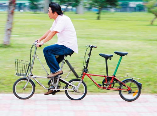 前述兩項設計安裝到小摺車上後,便可成為全家出遊的好夥伴,對行李廂容積不足或是家中孩子還小的父母而言,「小摺連結架」堪稱假日闔家騎車出遊的救贖。相同理念亦可應用在26吋登山車之上,但由於其輪圈直徑較大、無法再橫跨在兩車之間,稍稍修改連接架使拆卸下來的輪圈與「車身平行」,亦可克服這個問題。