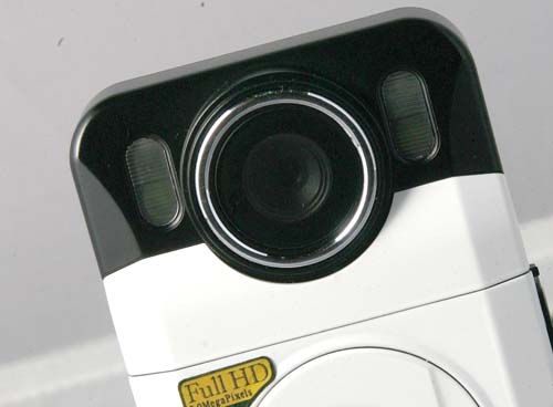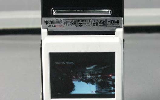 打開保裝拿在手上一看,若以DV的標準來看,體積真的很小,不過若作為行車紀錄器似乎又大了一些,好在後方有個2吋的LCD螢幕,因此即使會占掉些許前擋空間也是值得。整個外型設計相當洗鍊,正面有顆大大的鏡頭,以及兩側的直立式LED補光燈泡,背面除2吋的TFT LCD螢幕外,下方還設有一顆按鍵與一組多動向小型搖桿,應該是用來控制選單介面的工具,左右側邊則設有許多按鍵與插孔,提供更多的控制方式與輸出格式,其中最常用到的影像輸出孔,除常見的USB接孔外,還設有一組HDMI的小型插孔,可直接與Full HD規格的液晶電視連接,立即播放出高清晰度的錄影畫面,這點是其他受訪產品所沒有的設計。機身可分成兩部分,上半部可向後搖擺,方便使用者調整鏡頭拍攝角度。