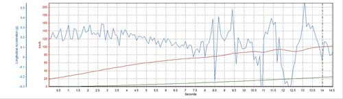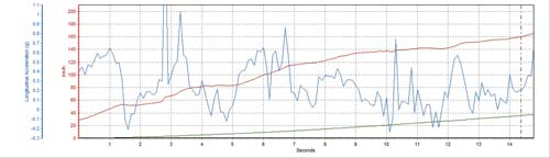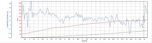 最後一輛換裝Auto外露香菇頭kit及單出尾管的馬二,其反應相當迅速,在31.55km/h時就發揮出0.354G的最大加速G值,而雙管則是慢上5km/h左右才達到最大G值,以圖表來看單管的加速G值起伏變化較大,且能持續維持較不易衰退,也因此得到12.76秒、233.10公尺的成績,其實以NA車的改裝來說,排氣回壓的要求當然比渦輪車來得更加嚴苛,輪胎抓地力的應用則無論渦輪車還是自然進氣車都相同,這次自然進氣幫測試較不公平之處就是改裝馬二的輪胎尺寸沒有統一,也希望有下次可完全統一輪胎規格,以便提昇測試公平性。
