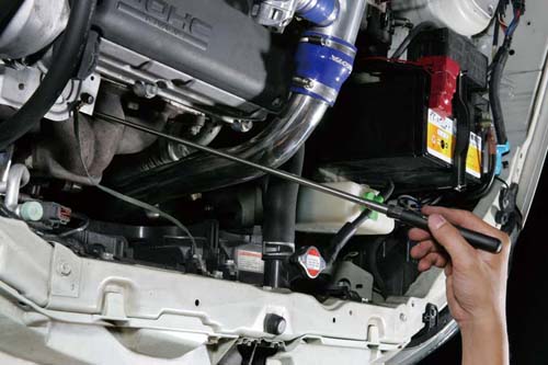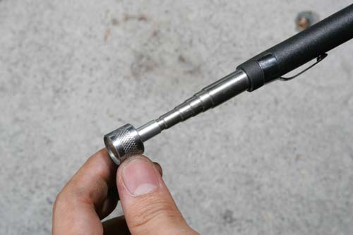 沒有掌握時機的話往往很容易讓螺絲掉下去,若掉在地上那還好,萬一掉到引擎室深處或零件間空隙的話,用一般工具是很難取出的,只能依賴這種可伸縮長度的磁鐵棒吸附螺絲後,才能取出。