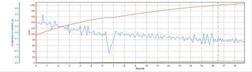 換上四檔後這輛K6能持續保持0.2上下的加速力道,與上一輛渦輪出風量較大的Lancer相比,的卻更具加速水準,不過由於渦輪出風量不足的影響,後半段的50km/h加速確花費了11秒以上的時間,如果車主能將腹內鍛化一番,換上TD05 16G渦輪機應可輕易突破10秒門檻。