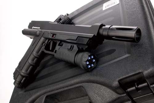 | Tiberius T8特勤用限定版鎮暴手槍,使用0.65(16.8mm)口徑國際標準規格多種漆彈球,每彈匣可容納8發。使用拋棄式12公克CO2小鋼瓶,方便快速替放。彈匣可另外選購、搭配12公克CO2小鋼瓶,能攜帶多組備用彈匣快速交替。(更換彈匣時、氣瓶也隨之更換,具有可靠之作戰持續力。) 彈道穩定精準度高,初速為:125 m/s(450FPS)極限,並可調整氣閥設定初速。(建議售價35,000元 |