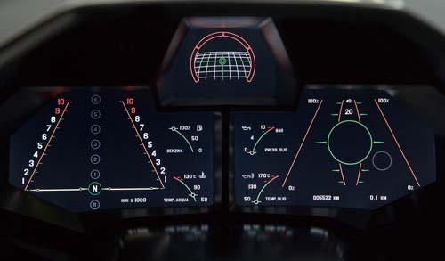 不只外觀像戰鬥機,本車內裝儀錶配備有如戰機抬頭顯示器般飛航儀表板,傳統的車速與轉速呈現方式被轉化成戰機儀錶上的高度與速度錶,在加上類似F1賽車的G-Force離心力顯示功能,種種創意巧思著實讓駕駛者或得如同駕馭戰機般的滿足感,原廠也貼心的設計了切換按鈕,讓駕駛者選擇切換飛航顯示或傳統儀錶模式。
