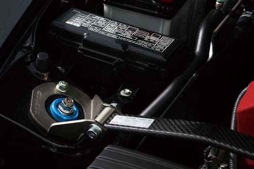 用來強化避震塔結構剛性的「三角座」,能讓車身動態反應更直接,提昇操控靈敏度,專精Honda車系的Spoon和J’s Racing都有在賣。